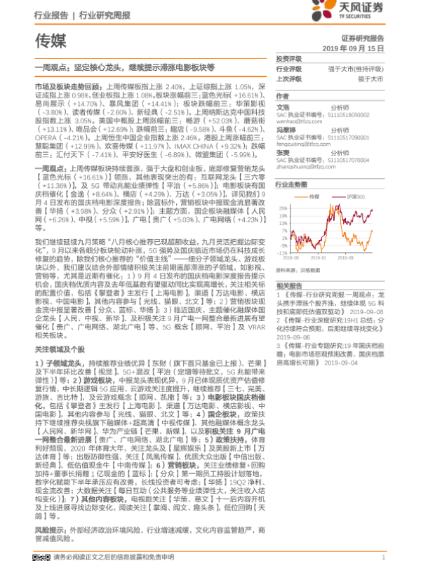 【天风证券】【20190915】传媒一周观点:坚定核心龙头,继续提示滞涨电影板块等-25页 行业研究