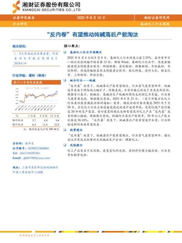 【湘财证券】【20250810】基础化工行业周报:“反内卷”有望推动纯碱落后产能淘汰-5页 行业研究