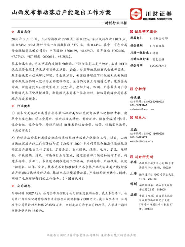 【川财证券】【20200513】材料行业日报:山西发布推动落后产能退出工作方案-3页 证券期货研究报告