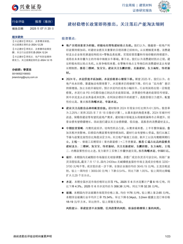 【兴业证券】【20250720】建筑材料行业周报:建材稳增长政策即将推出,关注落后产能淘汰细则-23页 证券期货研究报告