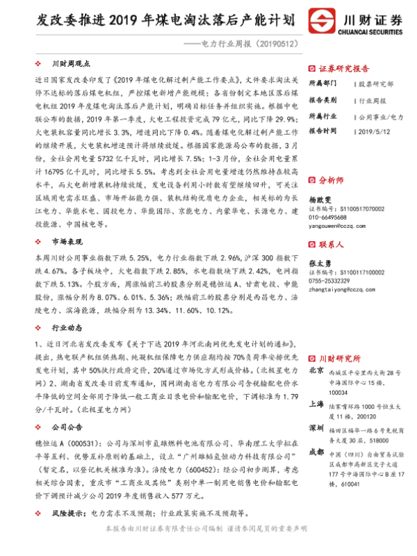 【川财证券】【20190512】电力行业周报:发改委推进2019年煤电淘汰落后产能计划-10页 行业研究