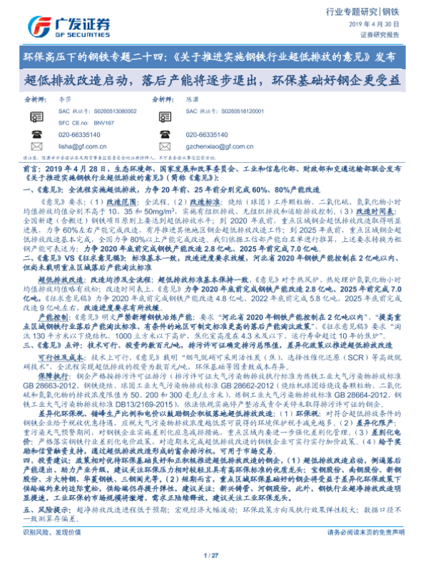 【广发证券】【20190430】环保高压下的钢铁专题二十四:《关于推进实施钢铁行业超低排放的意见》发布-超低排放改造启动,落后产能将逐步退出,环保基础好钢企更受益-27页 行业研究