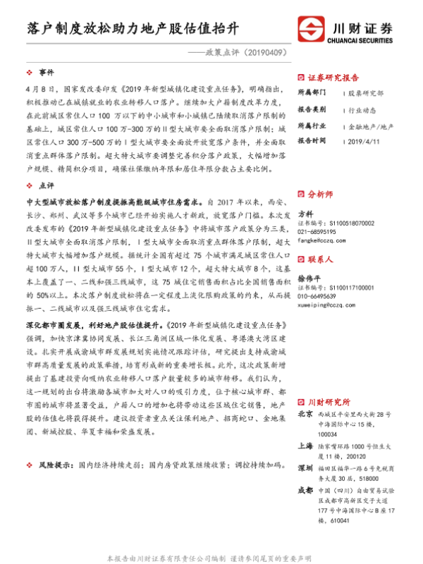 【川财证券】【20190411】落户制度放松助力地产股估值抬升-2页 行业研究