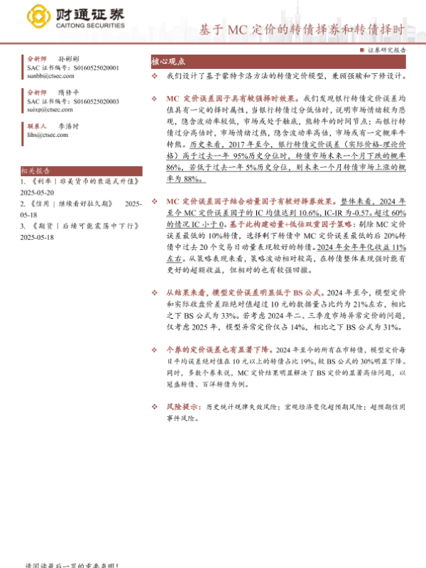 【财通证券】【202505】基于MC定价的转债择券和转债择时-11页 证券期货研究报告