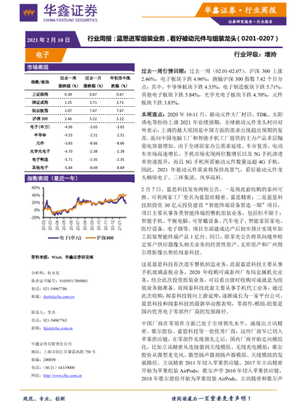 【华鑫证券】【20210210】20210210-华鑫证券-电子行业周报:蓝思进军组装业务,看好被动元件与组装龙头-16页 行业研究