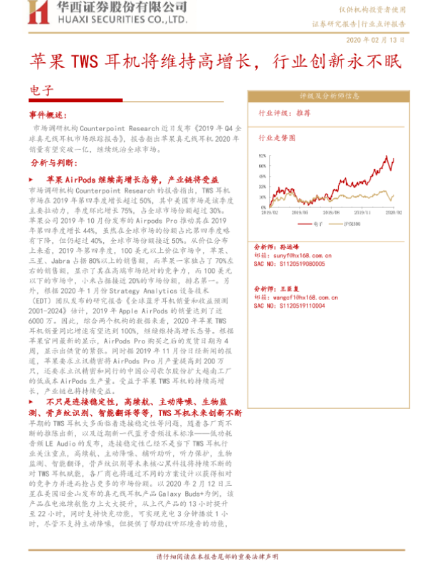 【华西证券】【20200213】苹果TWS耳机将维持高增长,行业创新永不眠-4页 行业研究