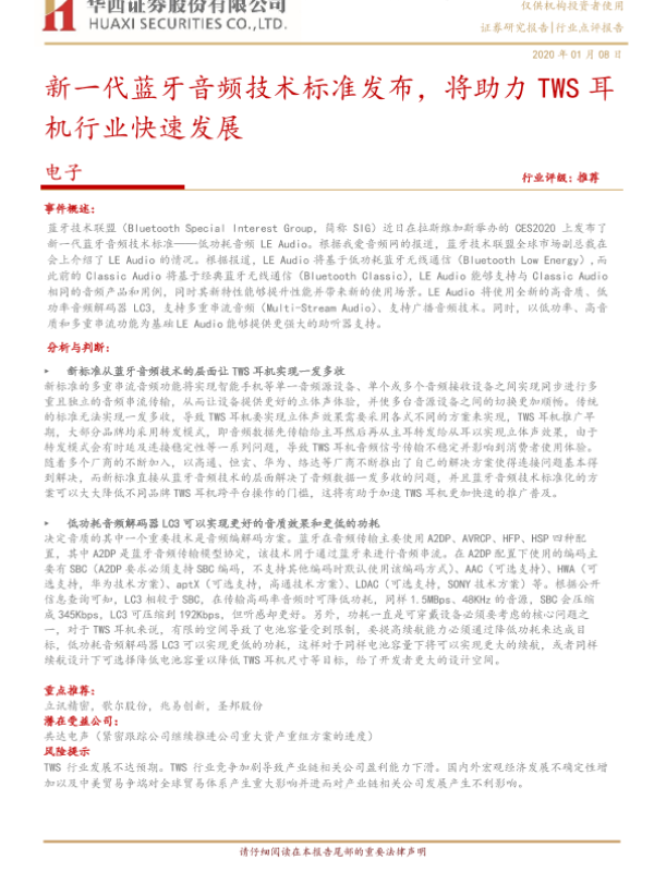【华西证券】【20200108】新一代蓝牙音频技术标准发布,将助力TWS耳机行业快速发展-4页 行业研究