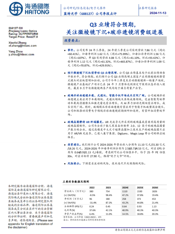 【海通国际】【20241113】蓝特光学(688127)公司季报点评:Q3业绩符合预期,关注微棱镜下沉%2b玻非棱镜消费级进展-12页 行业研究