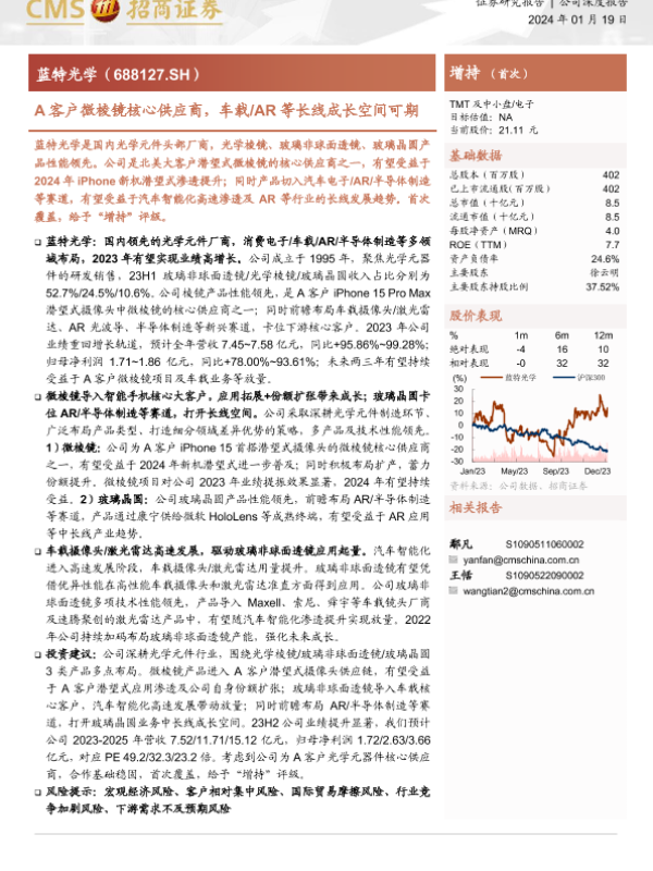 【海通证券】【20240119】A客户微棱镜核心供应商,车载 AR等长线成长空间可期-28页 行业研究