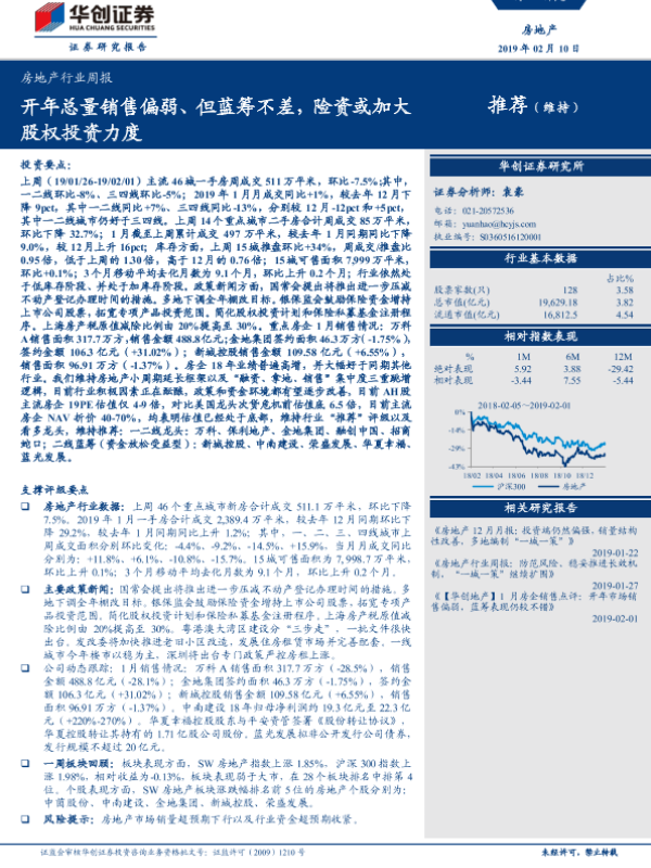 【华创证券】【20190210】房地产行业周报:开年总量销售偏弱、但蓝筹不差,险资或加大股权投资力度-25页 行业研究