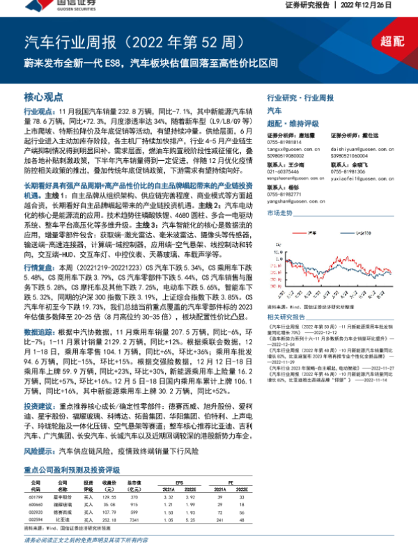【国信证券】【20221226】20221226-国信证券-汽车行业周报(2022年第52周):蔚来发布全新一代ES8,汽车板块估值回落至高性价比区间-32页 行业研究