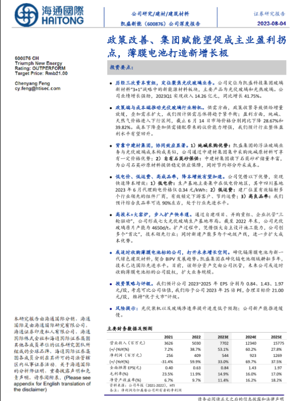 【海通国际】【20230804】凯盛新能-600876.SH-公司深度报告:政策改善、集团赋能望促成主业盈利拐点,薄膜电池打造新增长极-24页 行业研究