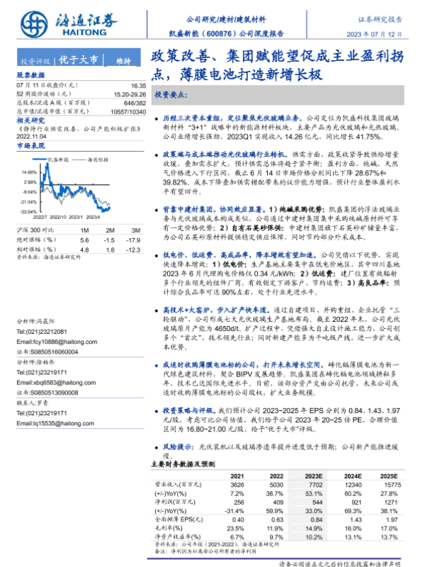 【海通证券】【20230712】20230712-海通证券-凯盛新能-600876.SH-公司深度报告:政策改善、集团赋能望促成主业盈利拐点,薄膜电池打造新增长极-19页 行业研究