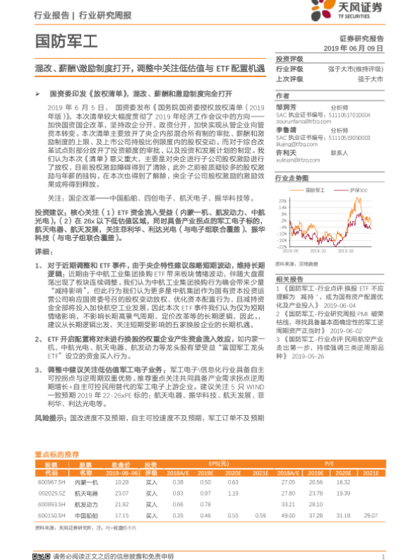 【天风证券】【20190609】国防军工行业研究周报:混改、薪酬激励制度打开,调整中关注低估值与ETF配置机遇-2页 行业研究