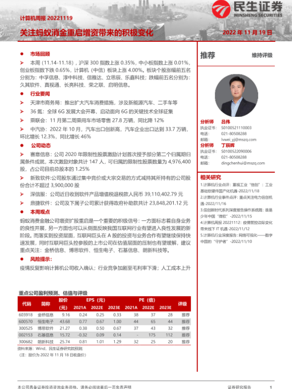 【民生证券】【20221119】20221119-民生证券-计算机周报:关注蚂蚁消金重启增资带来的积极变化-16页 行业研究