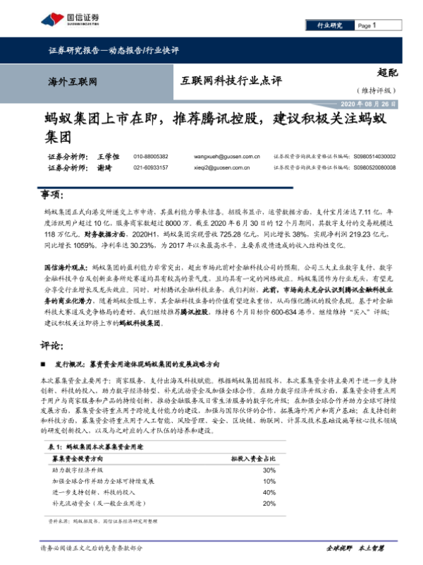 【国信证券】【20200826】20200826-国信证券-互联网科技行业点评:蚂蚁集团上市在即,推荐腾讯控股,建议积极关注蚂蚁集团-10页 行业研究