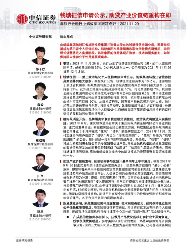 【中信证券】【20211129】非银行金融行业蚂蚁集团跟踪点评:钱塘征信申请公示,助贷产业价值链重构在即-4页 行业研究