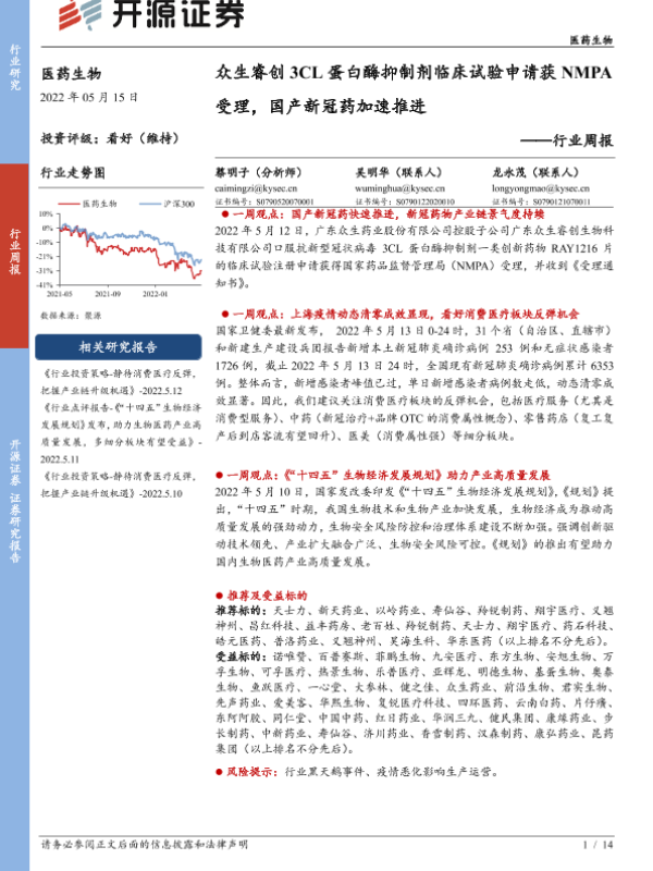 【开源证券】【20220515】医药生物行业周报:众生睿创3CL蛋白酶抑制剂临床试验申请获NMPA受理,国产新冠药加速推进-14页 行业研究