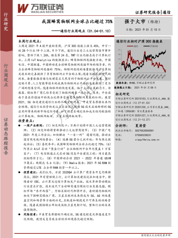 【万联证券】【20210110】20210110-万联证券-通信行业周观点:我国蜂窝物联网全球占比超过75%-14页 行业研究