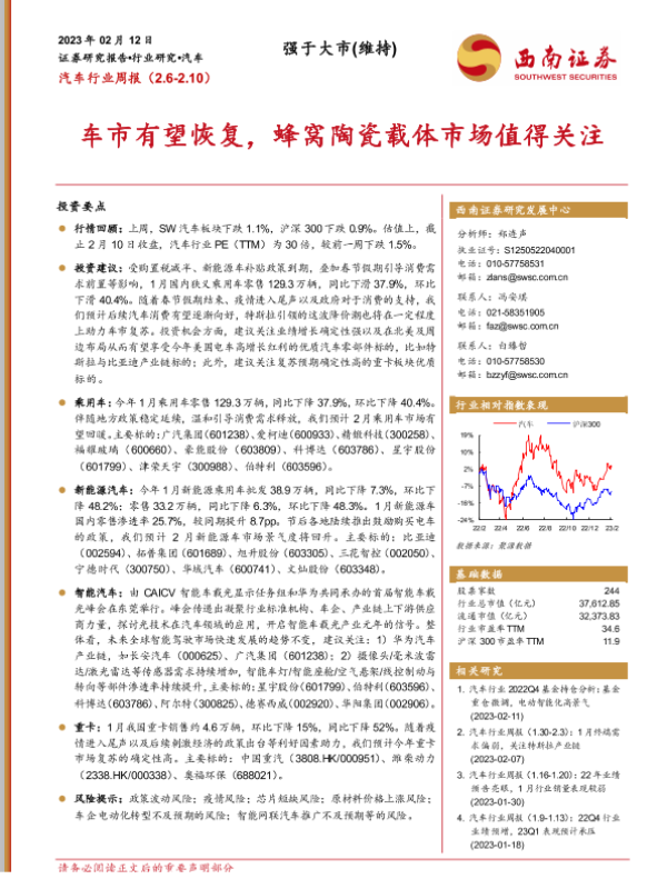 【西南证券】【20230212】汽车行业周报:车市有望恢复,蜂窝陶瓷载体市场值得关注-20页 行业研究