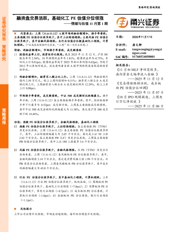 【甬兴证券】【202511】情绪与估值 11月第 1期:融资盘交易活跃,基础化工 PE估值分位领涨-11页 证券期货研究报告