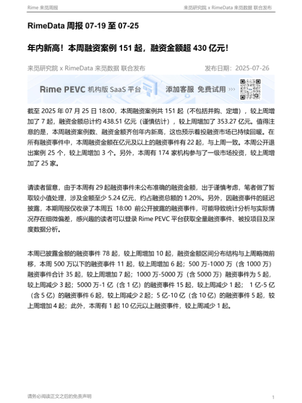 【来觅研究院 x RimeData来觅数据】【20250726】RimeData周报:年内新高!本周融资案例151起,融资金额超430亿元!-13页 市场调研