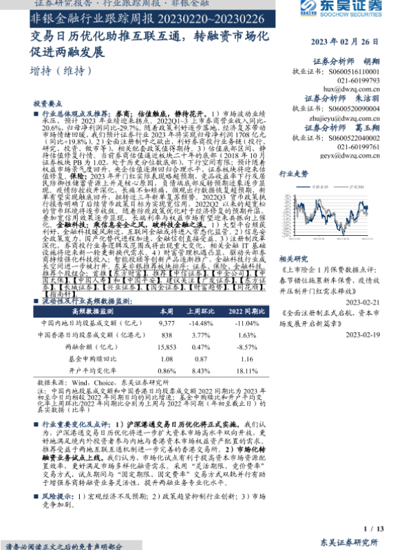 【东吴证券】【20230226】非银金融行业跟踪周报:交易日历优化助推互联互通,转融资市场化促进两融发展-13页 行业研究