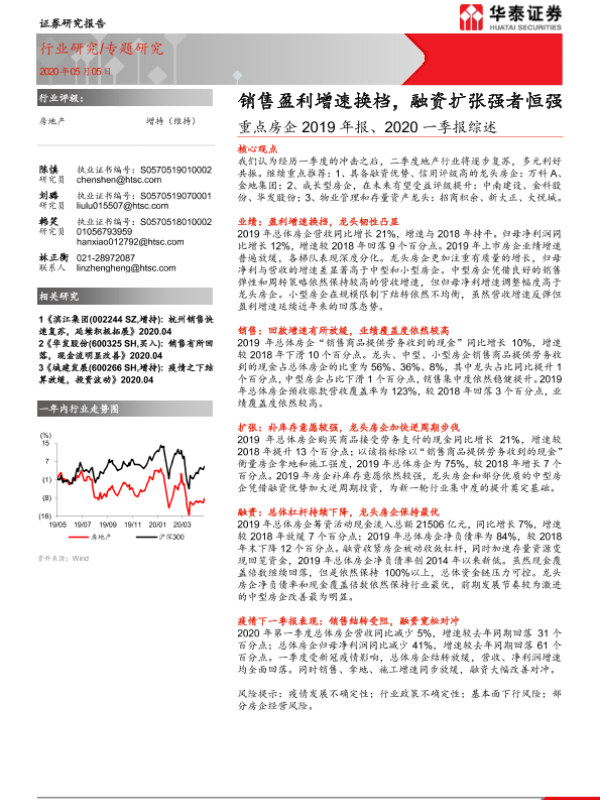 【华泰证券】【20200505】重点房企2019年报、2020一季报综述-销售盈利增速换档,融资扩张强者恒强-25页 行业研究