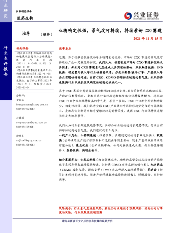 【兴业证券】【20211115】业绩确定性强,景气度可持续,持续看好CXO赛道-12页 行业研究