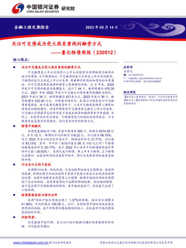【银河证券】【20230514】量化转债周报:关注可交债成为受大股东重视的融资方式-20页 行业研究