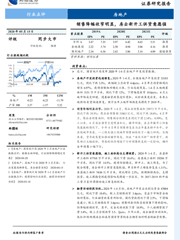 【财信证券】【20200515】销售降幅收窄明显,房企新开工供货意愿强-3页 行业研究