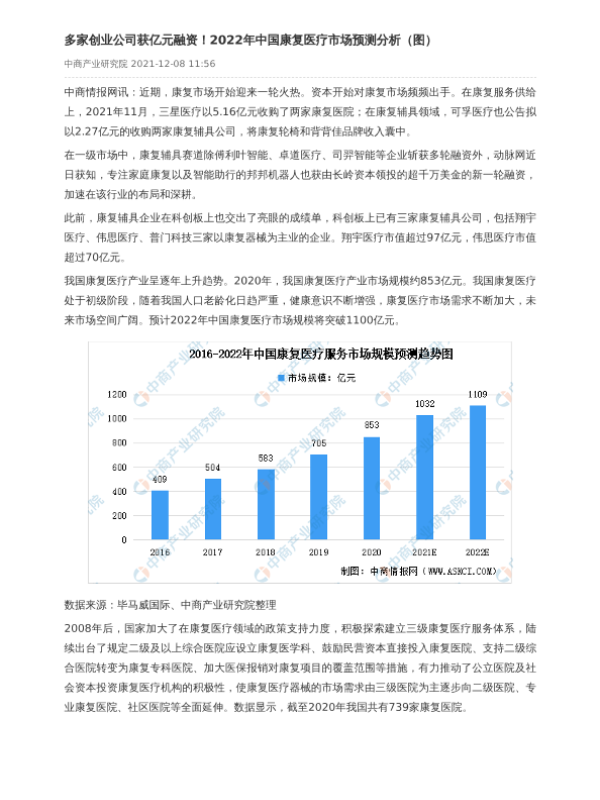 【中商产业研究院】【2022】多家创业公司获亿元融资!2022年中国康复医疗市场预测分析-2页 行业研究