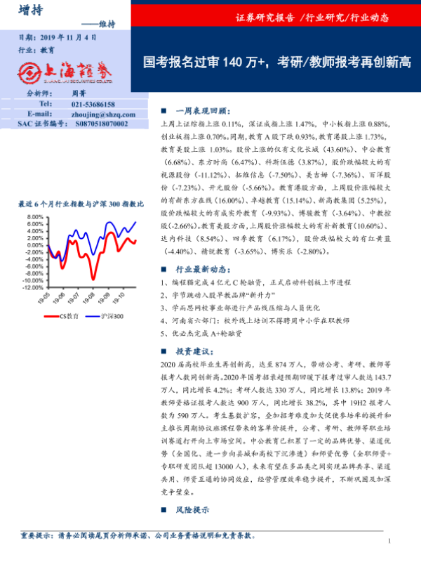 【上海证券】【20191104】20191104-上海证券-教育行业周报:国考报名过审140万+,考研/教师报考再创新高-9页 行业研究