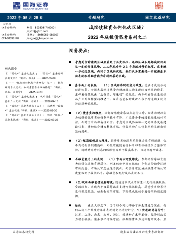 【国海证券】【20220525】2022年城投债思考系列之二:城投债投资如何优选区域?-25页 行业研究