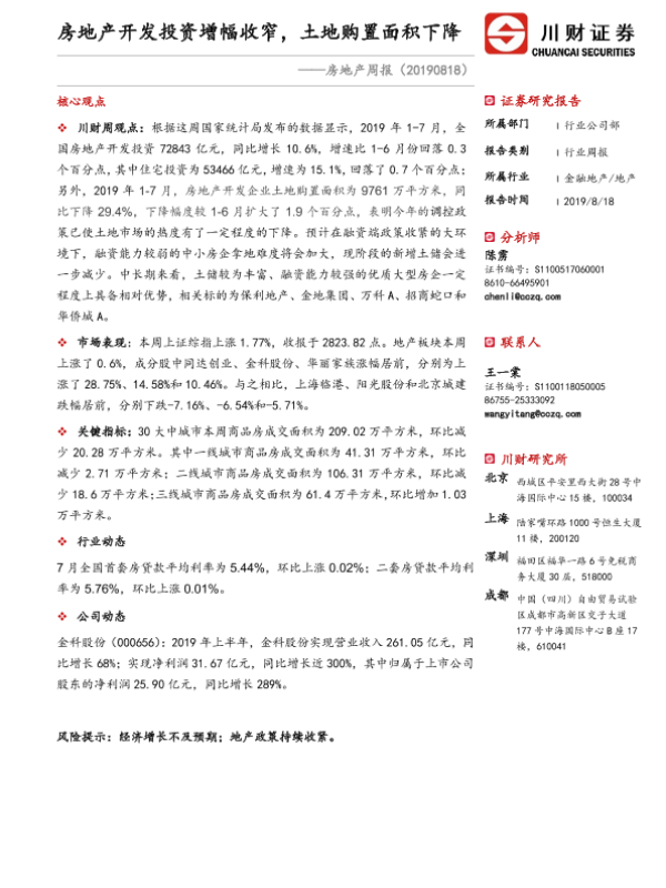 【川财证券】【20190818】房地产开发投资增幅收窄,土地购置面积下降-10页 行业研究