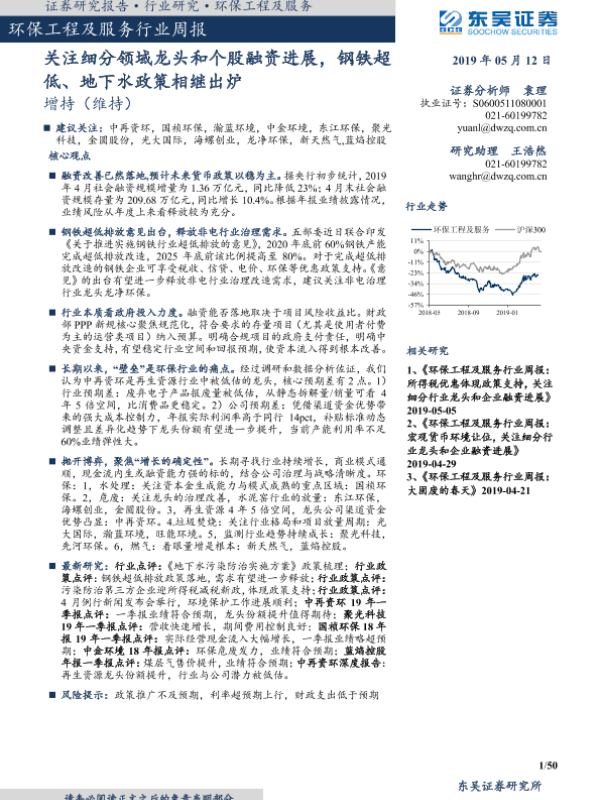 【东吴证券】【20190512】环保工程及服务行业周报:关注细分领域龙头和个股融资进展-50页 行业研究