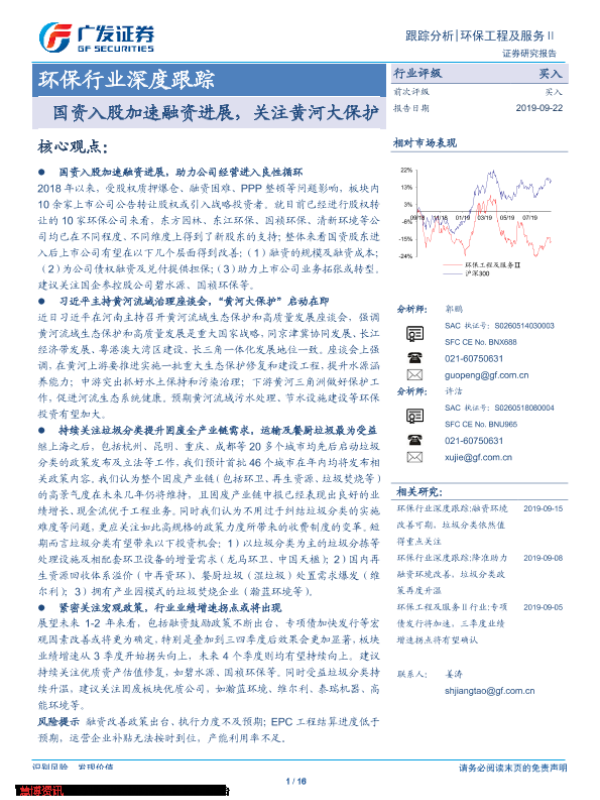 【广发证券】【20190922】环保行业深度跟踪:国资入股加速融资进展,关注黄河大保护-16页 行业研究