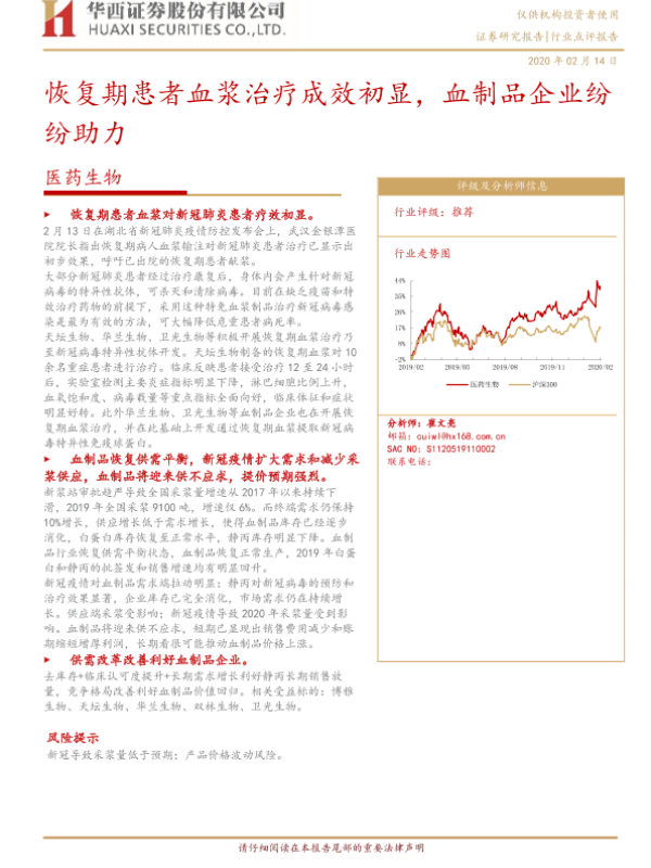 【华西证券】【20200214】恢复期患者血浆治疗成效初显,血制品企业纷纷助力-4页 行业研究