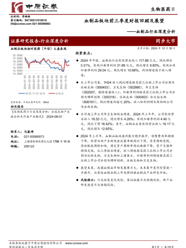 【中原证券】【20241030】血制品行业深度分析:血制品板块前三季度财报回顾及展望-15页 行业研究