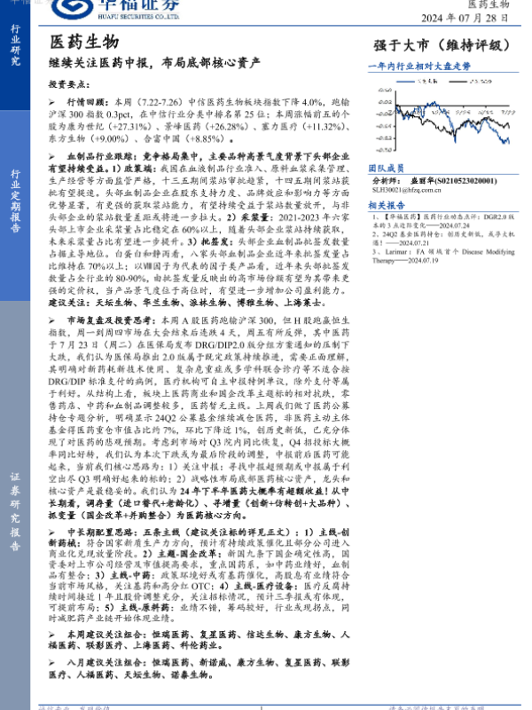 【华福证券】【20240728】继续关注医药中报,布局底部核心资产-15页 行业研究
