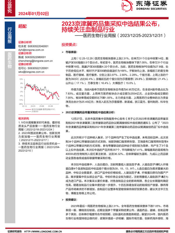 【东海证券】【20240102】2023京津冀药品集采拟中选结果公布,持续关注血制品行业-15页 行业研究
