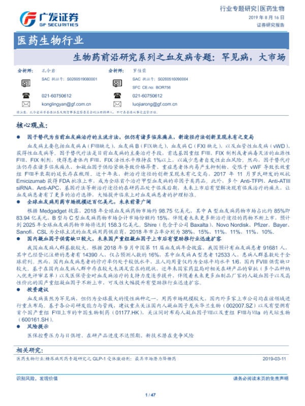 【广发证券】【20190816】生物药前沿研究系列之血友病专题:罕见病,大市场-47页 行业研究