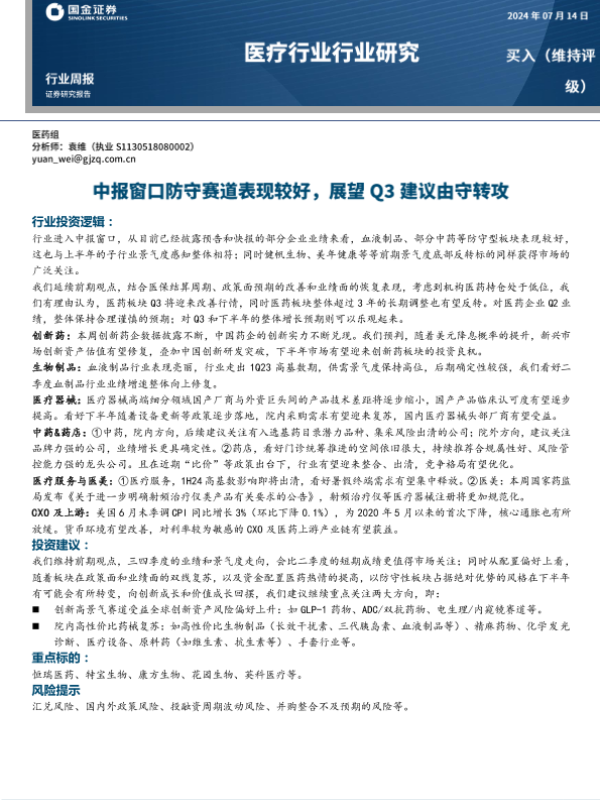 【国金证券】【20240714】医疗行业研究:中报窗口防守赛道表现较好,展望Q3建议由守转攻-12页 行业研究