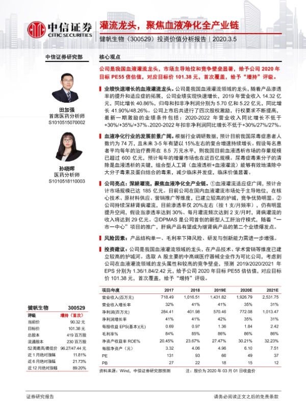 【中信证券】【20200305】20200305-中信证券-健帆生物-300529.SZ-投资价值分析报告:灌流龙头,聚焦血液净化全产业链-29页 行业研究
