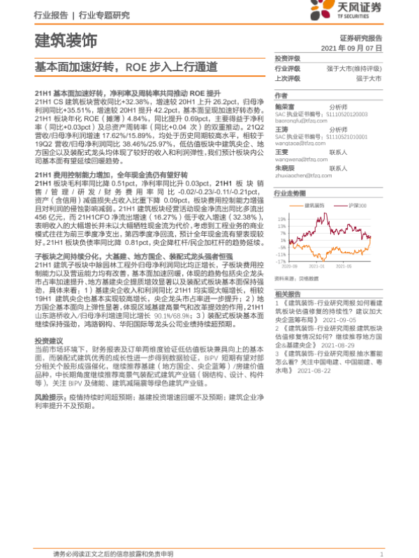 【天风证券】【20210907】建筑装饰行业专题研究:基本面加速好转,ROE步入上行通道-20页 行业研究