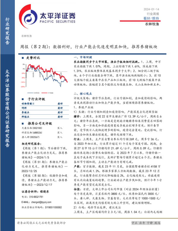 【太平洋证券】【20240114】农林牧渔周报(第2期):数据利好,行业产能去化速度明显加快,推荐养猪板块-17页 行业研究