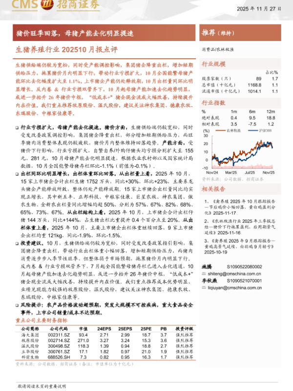 【海通证券】【202511】生猪养殖行业202510月报点评:猪价旺季回落,母猪产能去化明显提速-11页 证券期货研究报告