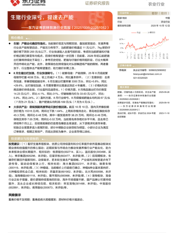【东方证券】【202510】农业行业 行业周报 | 生猪行业深亏,提速去产能-14页 证券期货研究报告