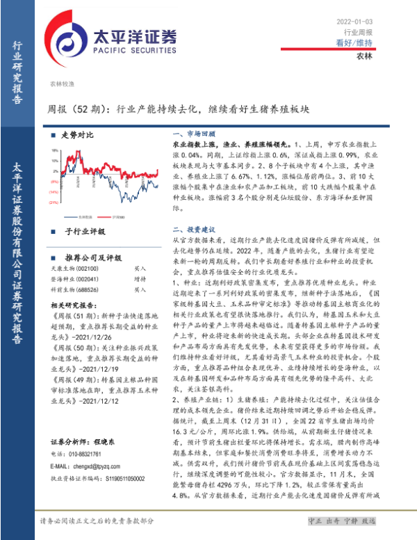 【太平洋证券】【20220103】农林牧渔周报(52期):行业产能持续去化,继续看好生猪养殖板块-15页 行业研究