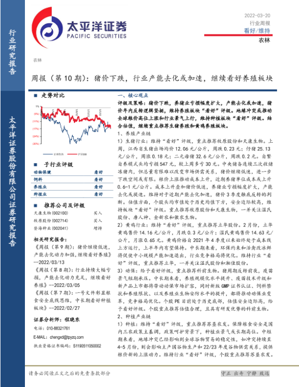 【太平洋证券】【20220320】20220320-太平洋-农林周报(第10期):猪价下跌,行业产能去化或加速,继续看好养殖板块-16页 行业研究